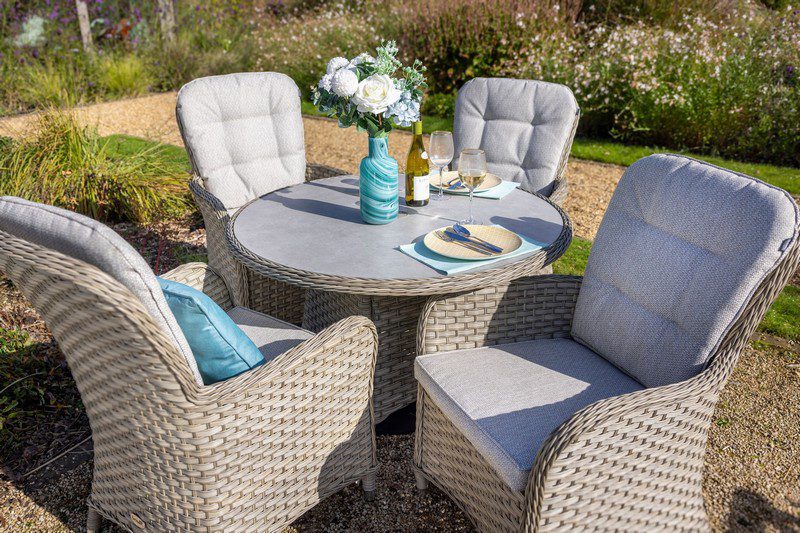 Let the Eton Four Seat Round Dining Set quickly become the hub of your outdoor living. Our elegant round table is crafted from resin weave, hand woven over a light but strong aluminium frame and finished with our Tuscan ceramic scratch resistant tabletop….a must for relaxing dining.