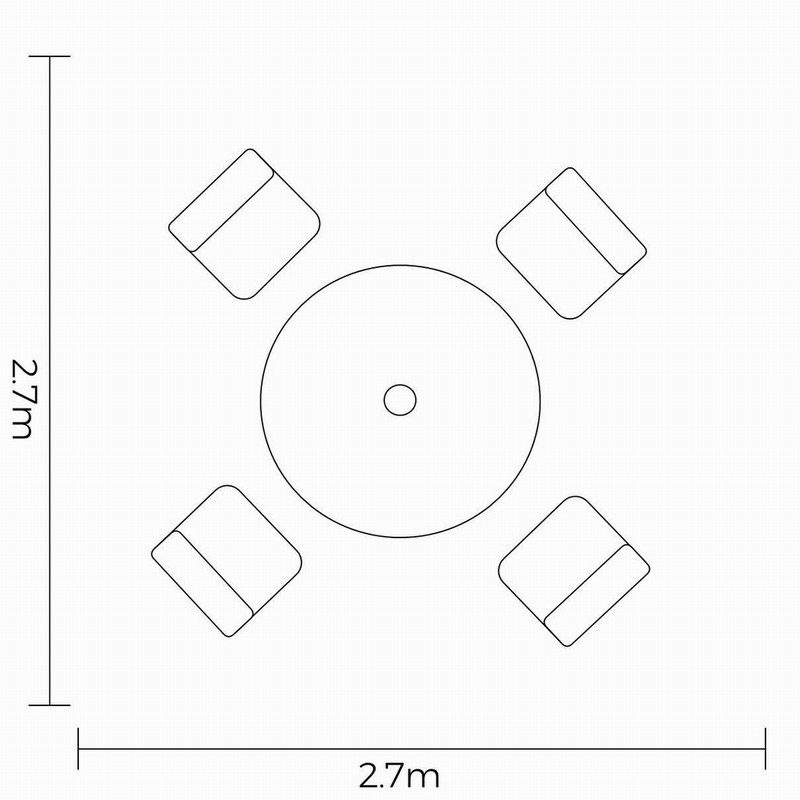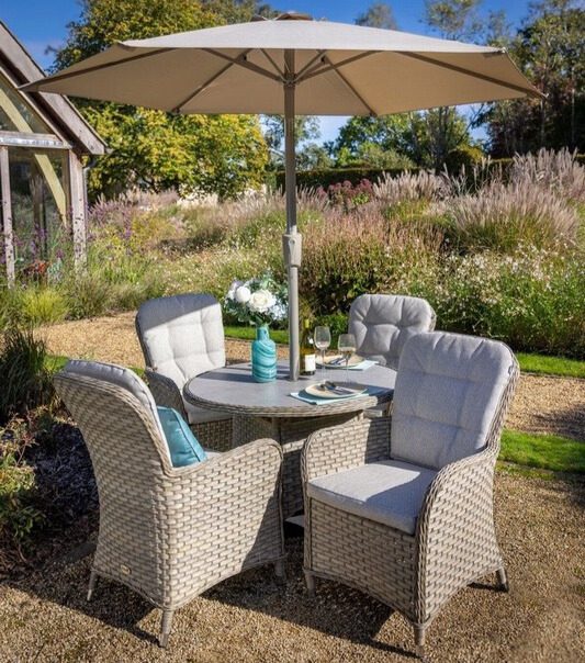 Set includes: 1 x 4-Seat Round Table, 4 x Dining Chairs, 1 x 2.5m Round Luxe Parasol (UPF50 Certified) & 15kg Concrete Base (not suitable on some composite decking -check with your manufacturer)