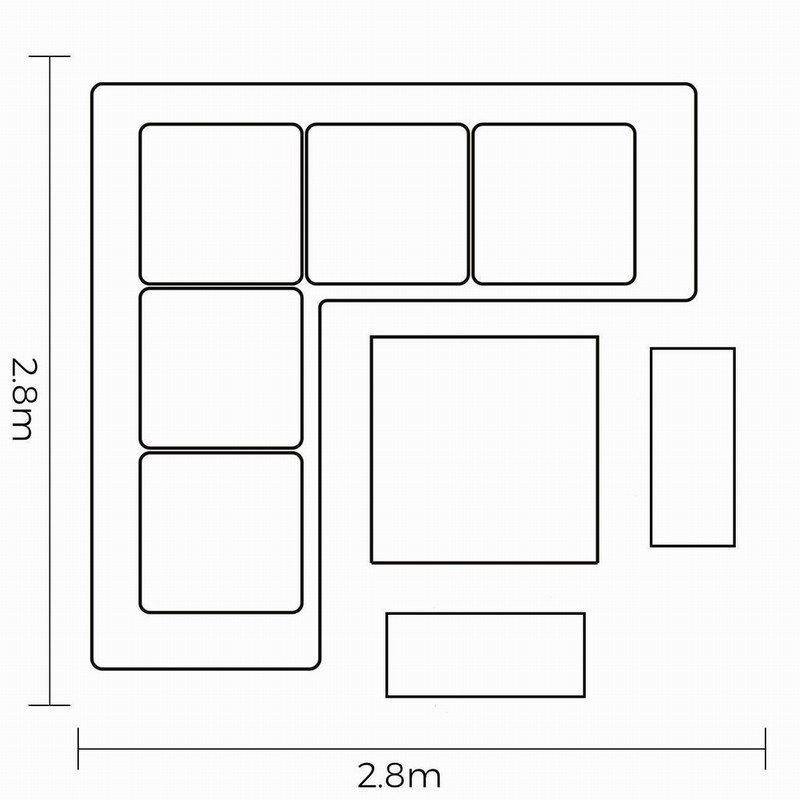 Set includes: 1 x Square Adjustable Table, 1 x Right-Hand Sofa, 1 x Left-Hand Sofa, 1 x Corner Seat, 2 x Grand Benches