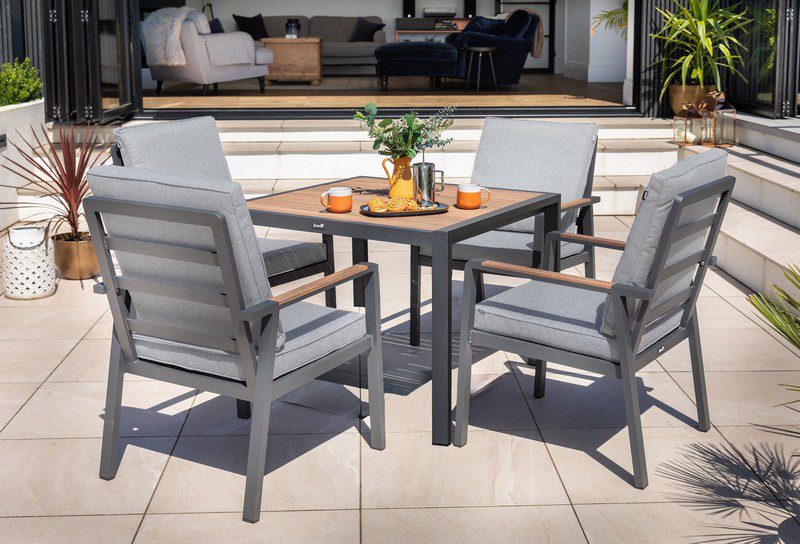 Bring contemporary sophistication to your outdoor space with the Sonas 4 Seat Square Dining Set. Perfect for smaller patios or garden areas, this set combines modern design with exceptional comfort and durability. The stylish square dining table features a Folie-wood look foiled aluminium tabletop, capturing the natural texture of wood while offering the long-lasting, low-maintenance advantages of aluminium.